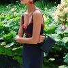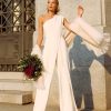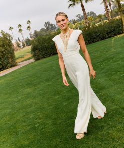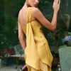 Mono largo con escote a pico de gasa fruncido y hombreras. Detalle de fajín fruncido.