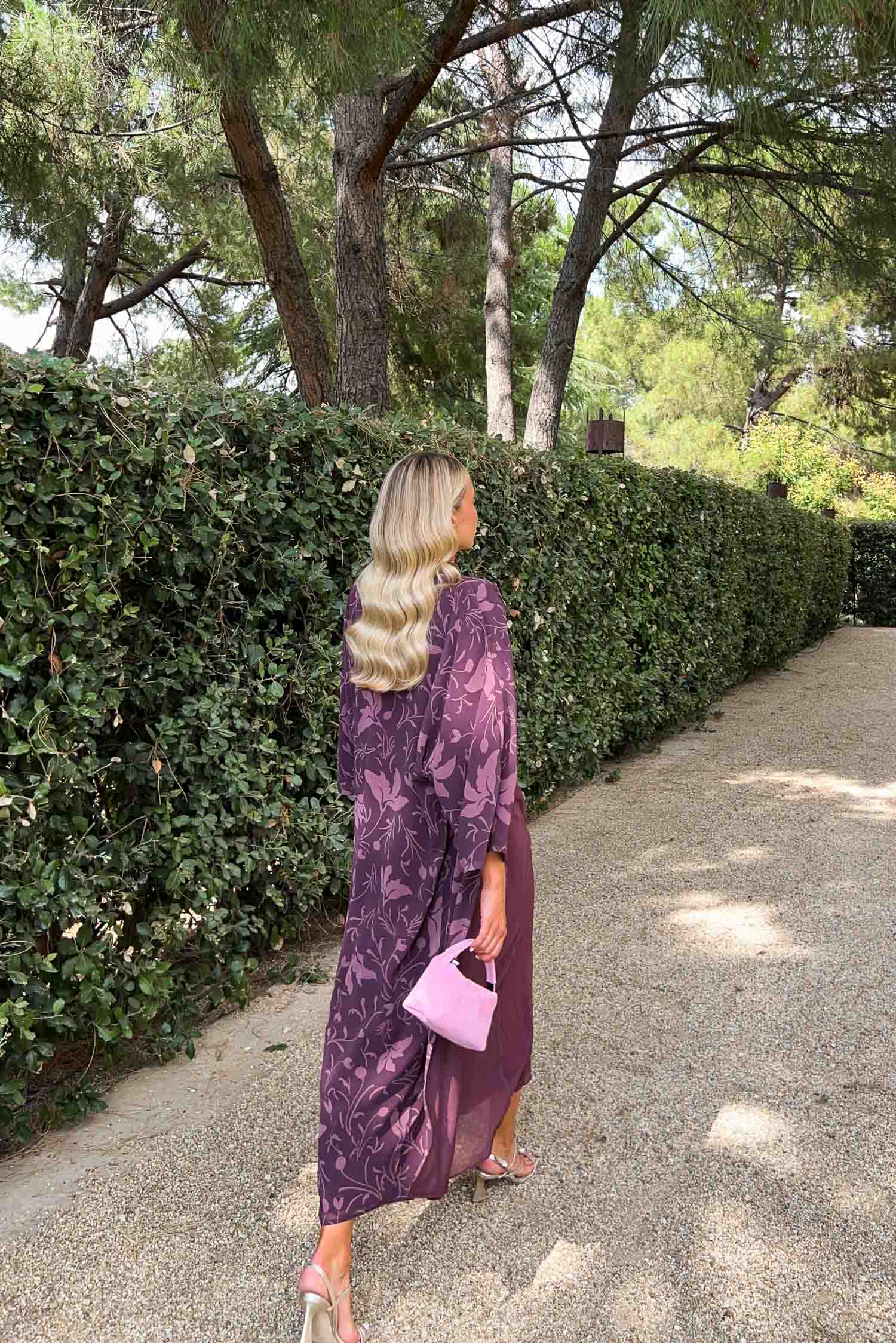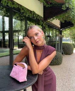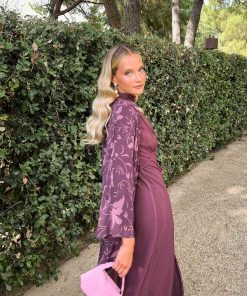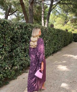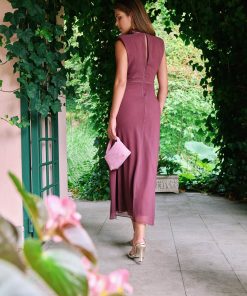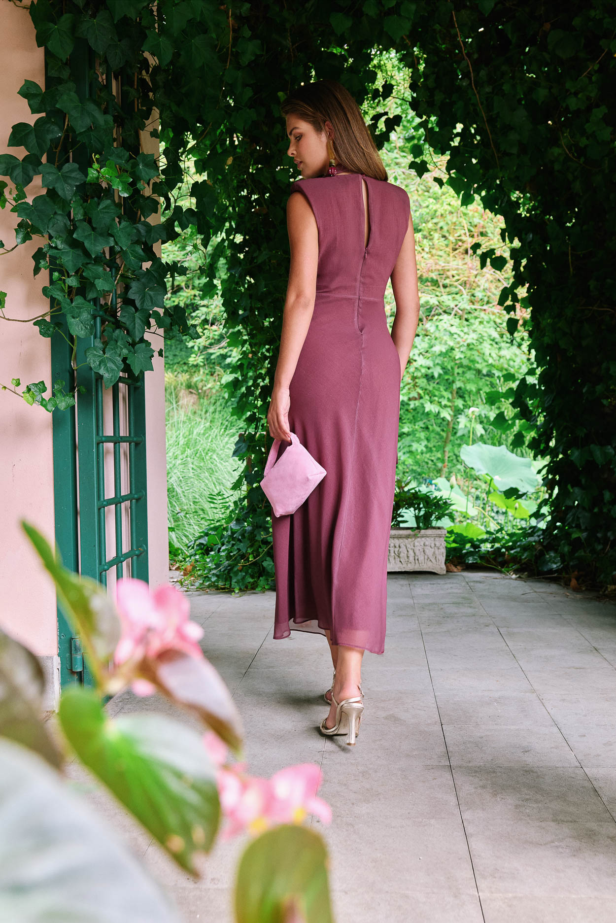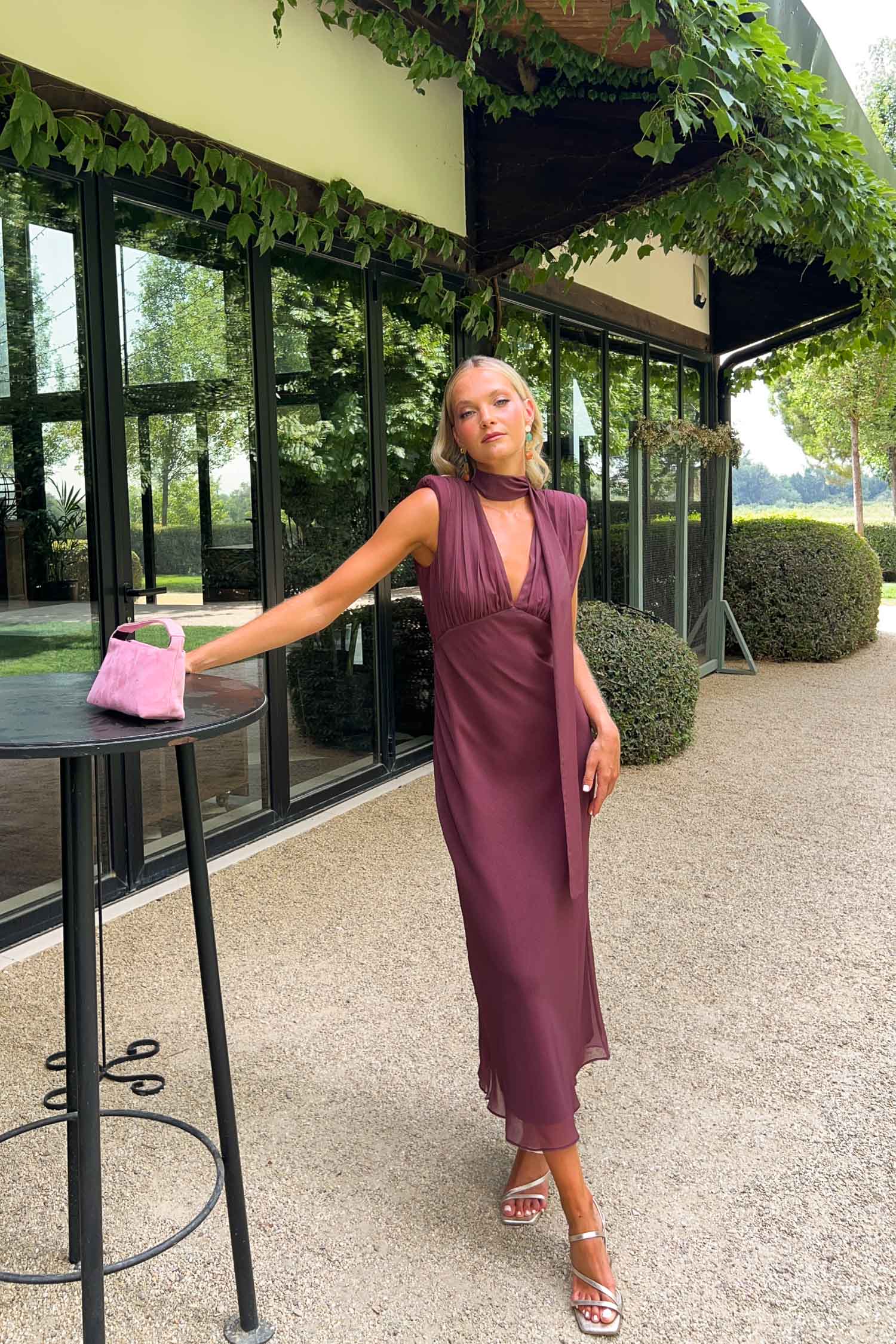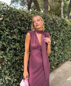 Vestido midi con escote en pico y frunces. Manga abullonada y detalle de pañuelo en el cuello.