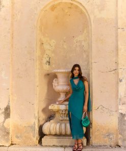 Vestido midi con drapeado en el escote, chal al cuello y bajo asimétrico con detalle de gasa a tono con ligero volante para darle movimiento.