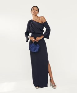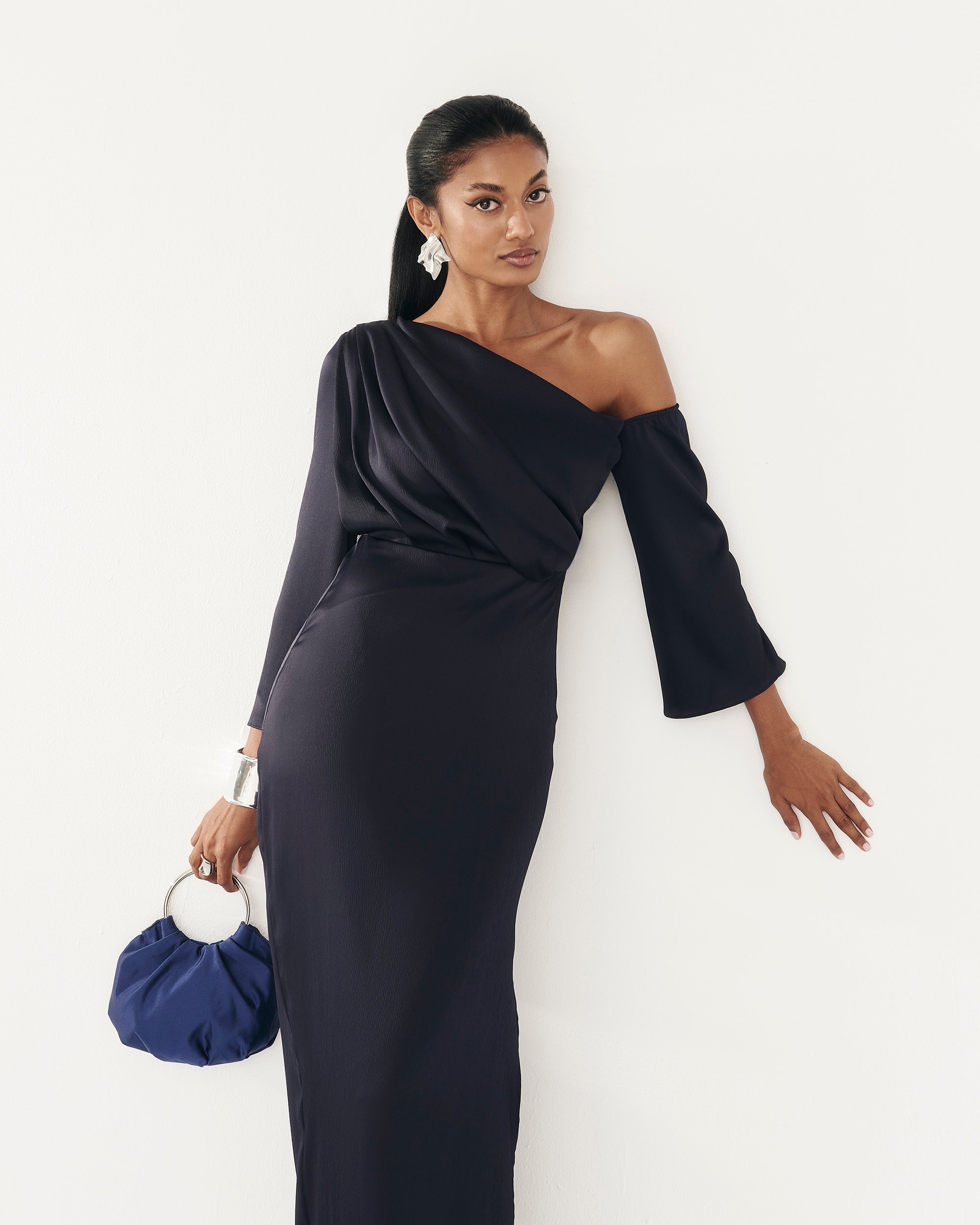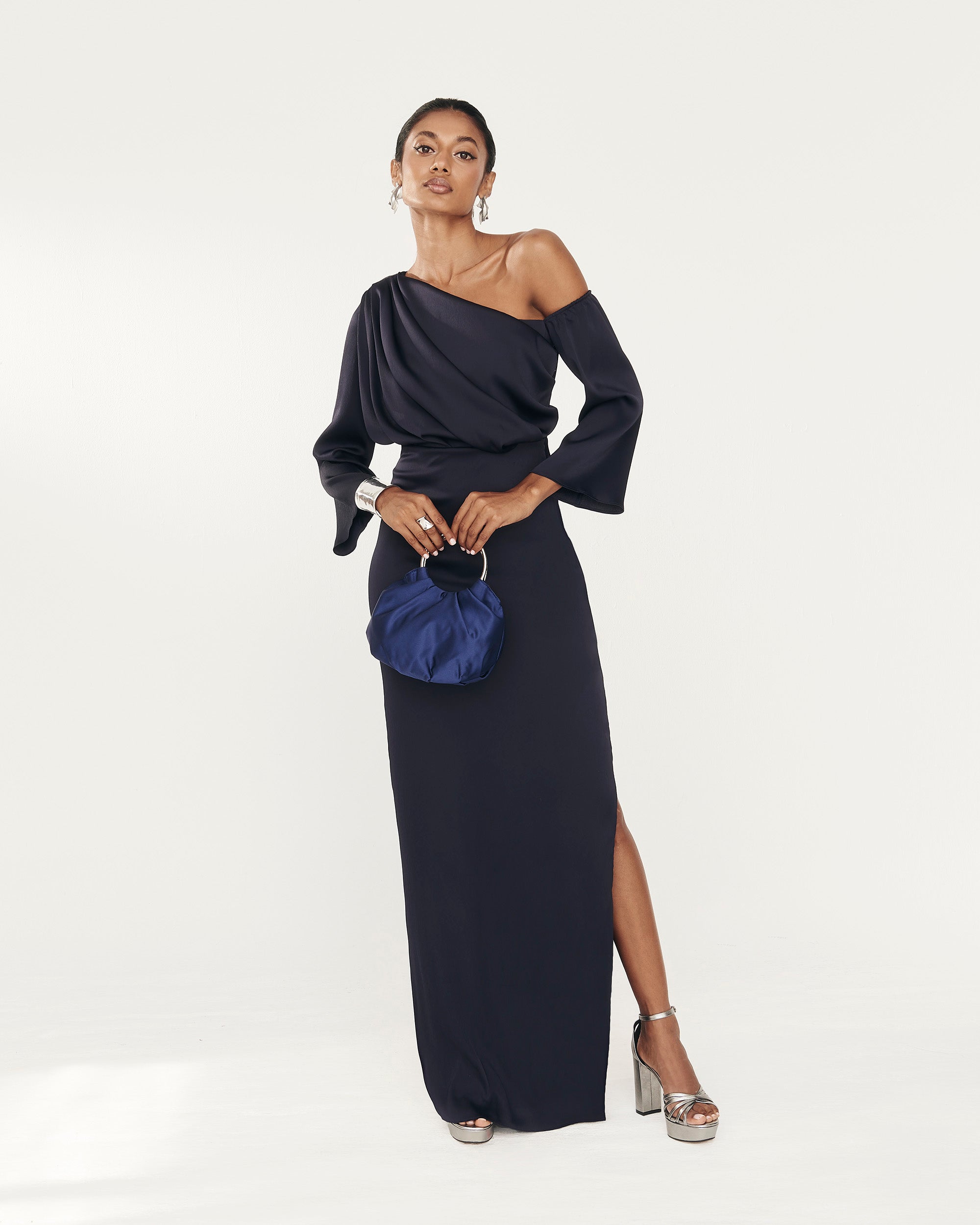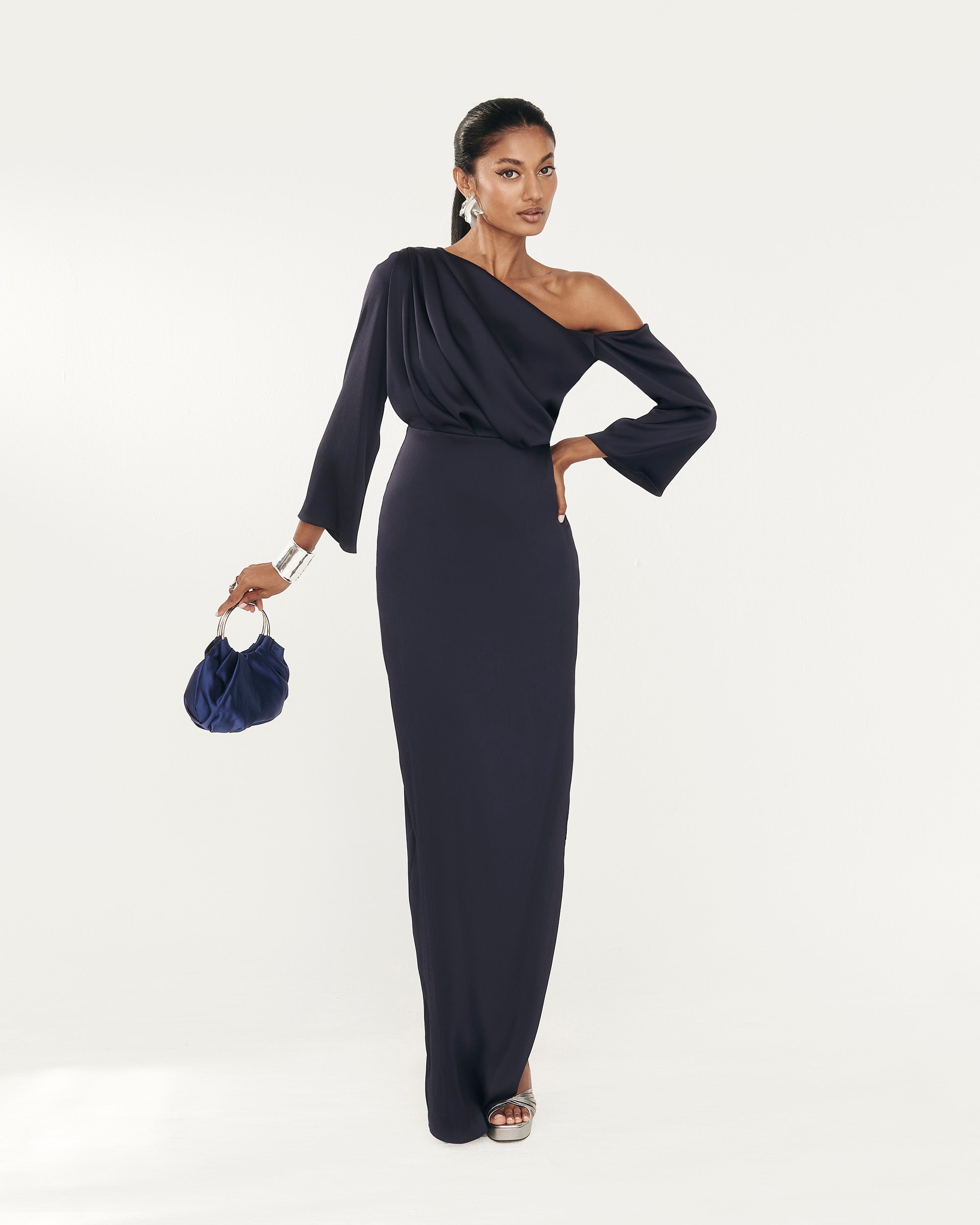 Vestido largo con escote asimétrico, drapeado en la parte delantera y abertura lateral.