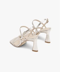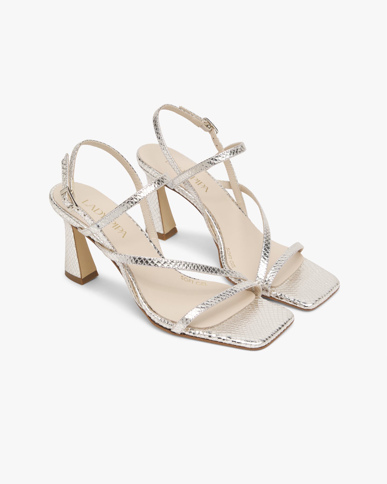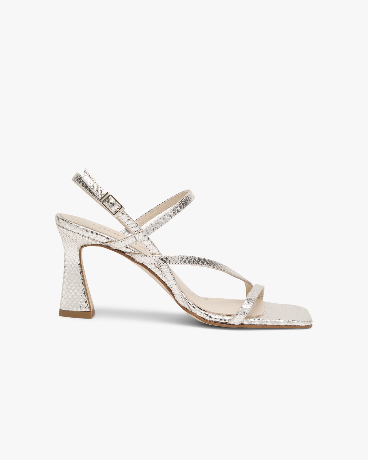 Sandalia de tacón asimétrico con tiras finas y puntera cuadrada. Cierre con hebilla. Tiene la planta muy acolchada para mayor confort.